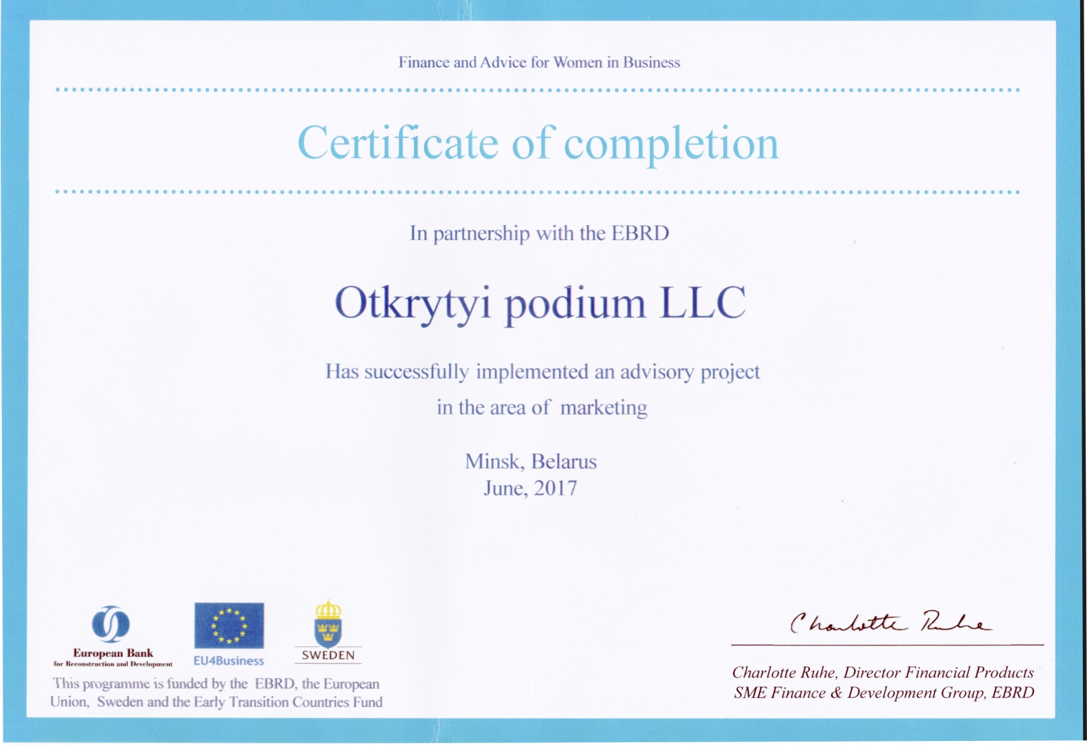 Организатор Belarus Fashion Week — агентство PR и коммуникаций "Открытый подиум" является сертифицированным консалтинговым агентством Европейского банка реконструкции и развития