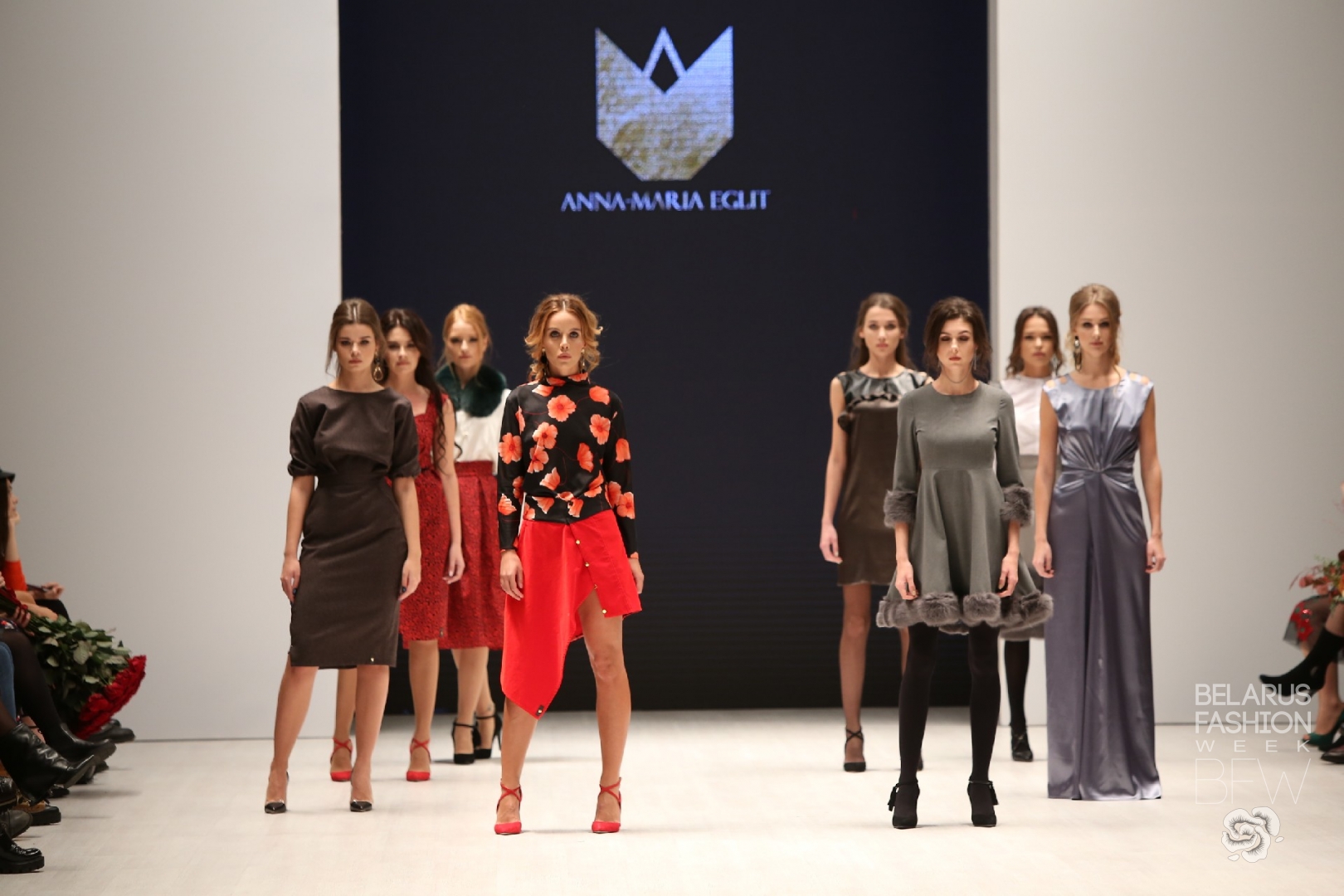 Anna-Maria Eglit сломала стереотипы о себе как дизайнере. Долгое время ее имя ассоциировалось с транспарентной и дерзкой одеждой, в которой сексуальность и провокация выходили на первый план. Новая коллекция выдержана в благородных жемчужно-серых, графитовых цветах с ярко- красными элементами. Сдержанность в декоре позволила акцентировать внимание на форме и фактуре. Шелк, шерсть с отделкой из натурального меха сделали образы моделей элегантными и стильными.