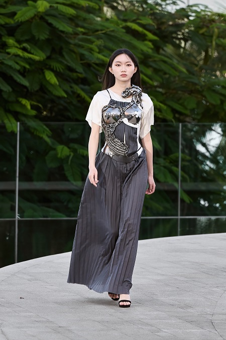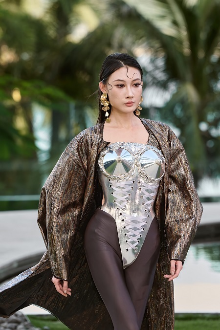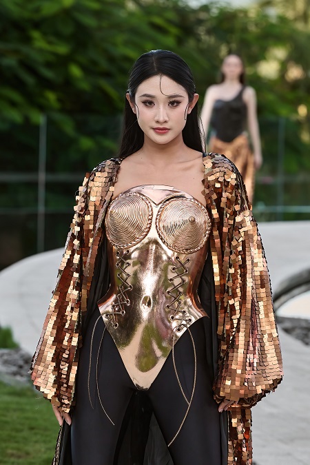 Коллекция скульптурных корсетов от Ирины Ромбальской и одежды от Татьяны Ефремовой уже демонстрировалась на неделе моды в Париже и международной неделе моды в Екатеринбурге. Специально для China Fashion Week были созданы новые позиции в коллекции и даже скульптурные гири - сумки. Коллекция с одной стороны наглухо скрывающая наготу, с другой - обезоруживающе открытая. Дерзкие образы, но при этом пропитанные бесконечной самоиронией и смелостью. Массивные хромированные и расписанные гири в руках моделей заявляют миру о бесконечной женской силе вопреки всему. Здесь и серебряное сердце (анатомическое, честное); и морковка с круассаном (амбивалентность любой худеющей); и большой крест. Эти гири не просто ноша, а часть личной истории. И каждый женский шаг по жизни — это танец, в котором она филигранно балансируем между обязанностями и мечтами. Героиня коллекции выходит за рамки оверсайза и стереотипов. Она одновременно сильная и уязвимая, закованная в корсеты словно в броню и доспехи. Ее внутренняя энергия плавит даже холодный металл.